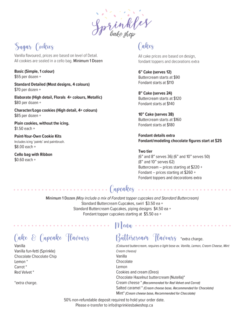 To place an order email info@sprinklesbakeshop.ca or DM on Instagram or Facebook